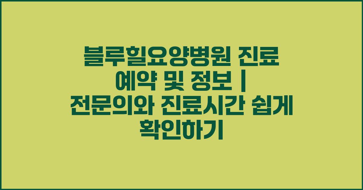 아래 표를 통해 블루힐요양병원 진료 예약 및 정보와 관련된 중요한 사항을 간략히 정리해보겠습니다. 이 표를 통해 여러분은 원하는 정보를 쉽게 찾아볼 수 있습니다.